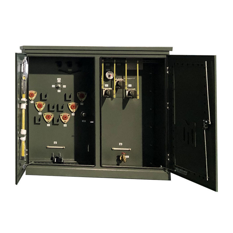 2) Transformateur 3 phases monté sur un tampon adopte un connecteur de prise de coude. Il peut être très pratique pour la connexion de câbles entrants haute tension. Utilisé comme interrupteur de charge en cas d'urgence.Il peut être branché et débranché sous tension..